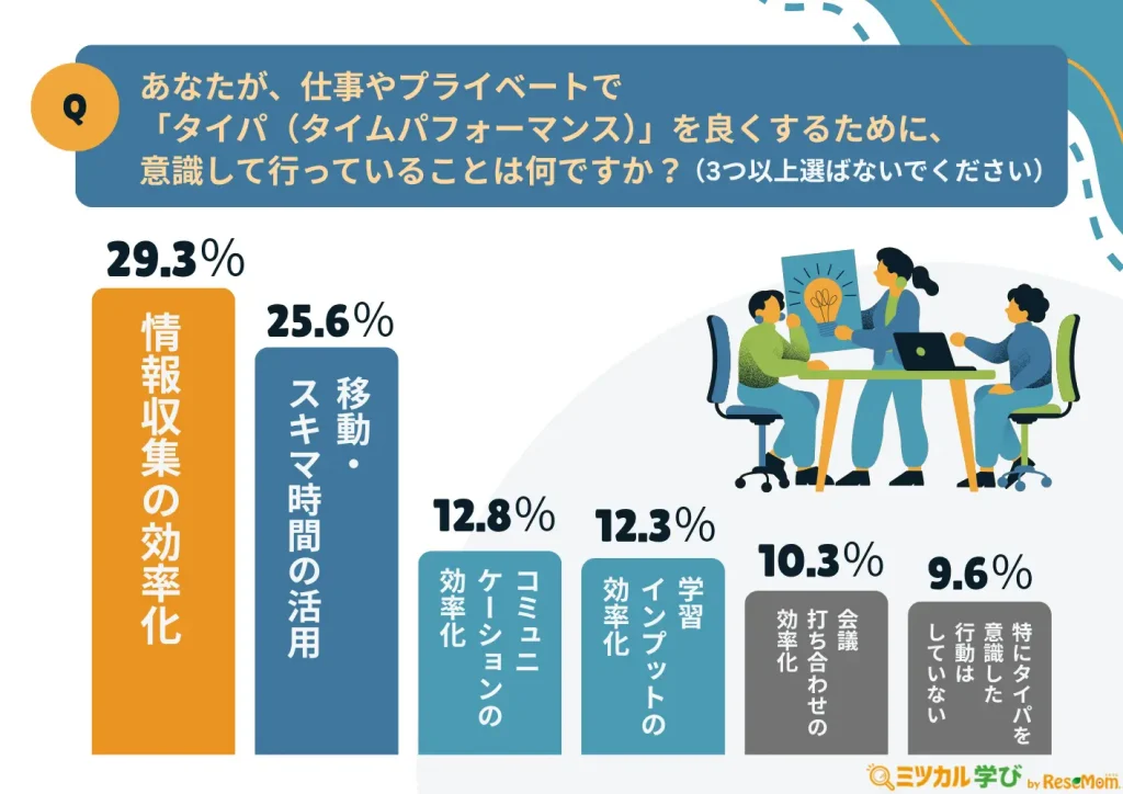 「あなたが、仕事やプライベートで『タイパ(タイムパフォーマンス)』を良くするために、意識して行っていることは何ですか?」と質問したところ、最も多い回答は「情報収集の効率化(29.3%)」でした。次いで「移動・スキマ時間の活用(25.6%)」、続いて「コミュニケーションの効率化(12.8%)」と「学習・インプットの効率化(12.3%)」はほぼ同率という結果です。