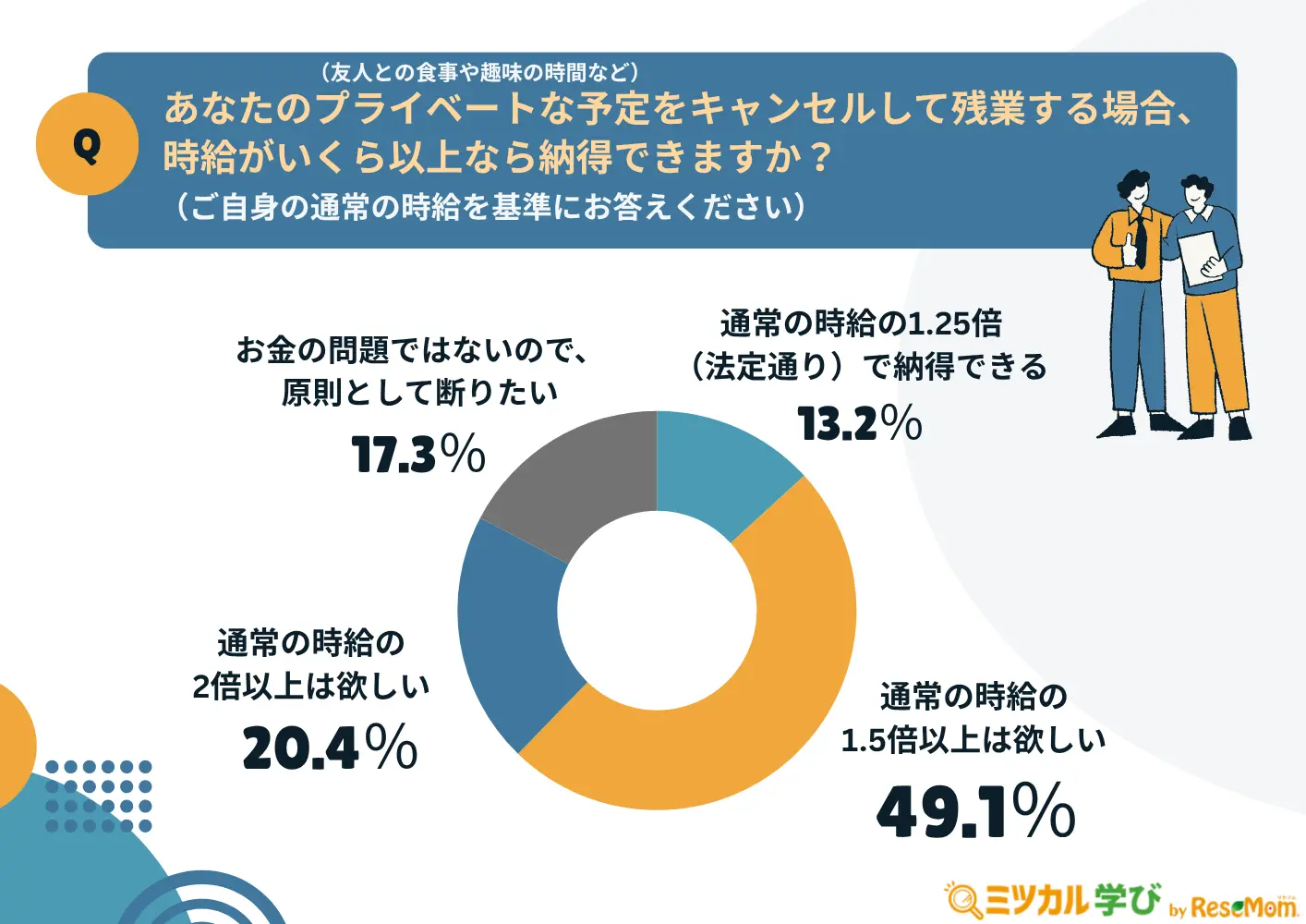 法定の基準よりも多い「通常の時給の1.5倍以上」または「通常の時給の2倍以上」の残業代なら、プライベートの予定をキャンセルしても納得できると回答した方が約7割を占めています。