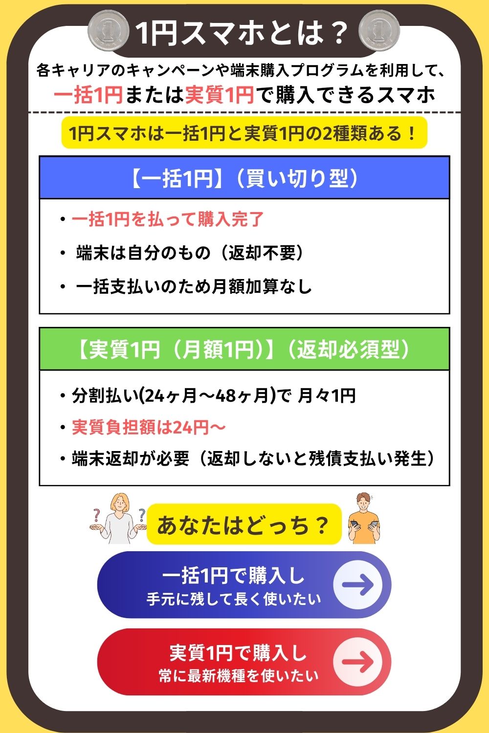 1円スマホとは、各キャリアが実施するキャンペーンで購入できる格安スマホのことで「一括1円」と「実質1円」の2種類があります。