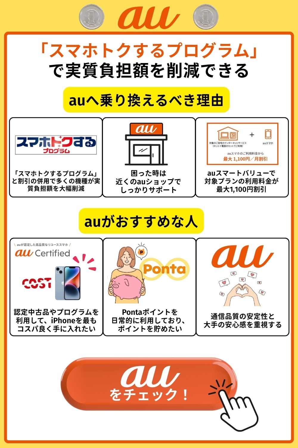 au | 145,400円※1 | 実質9,700円※2 →月々726円×22回+初回728円(129,300円お得) |