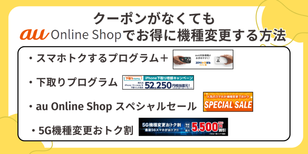 auオンラインショップで利用できるクーポンには特徴があり、組み合わせることでさらにお得に機種変更できるため、積極的に活用しましょう。