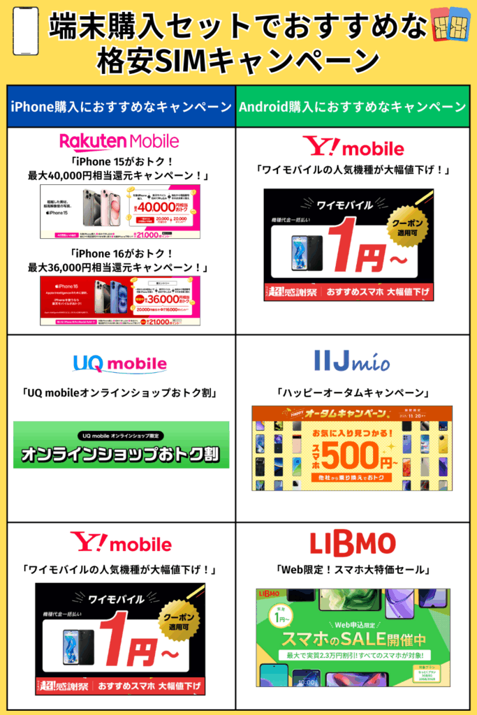 端末購入とセットでおすすめの格安SIMのキャンペーンを、iPhone/Android別に以下の表にまとめました。