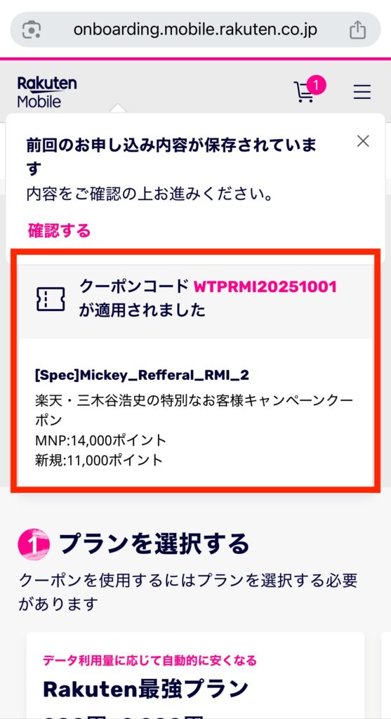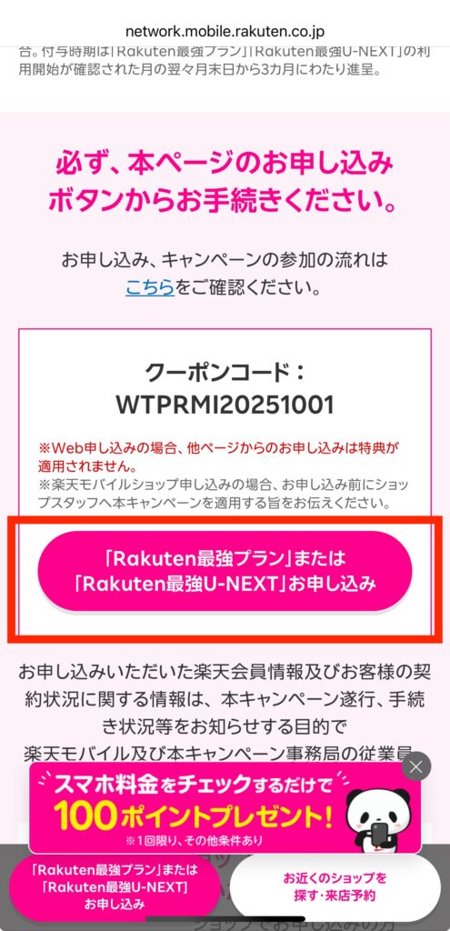 ただし他の楽天モバイル紹介ページから申し込んでもキャンペーンの対象にはならないので、必ずクーポンコードが掲載されているページで申し込みをしてください。