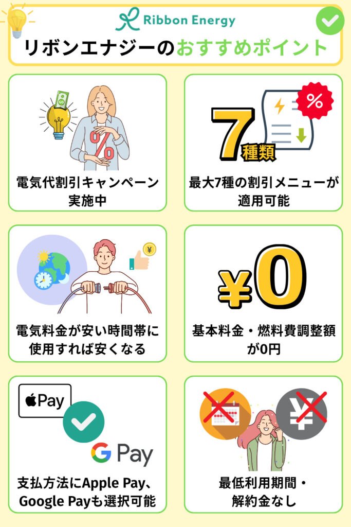 リボンエナジーにはさまざまな割引があり、最大で7つすべて適用できます。