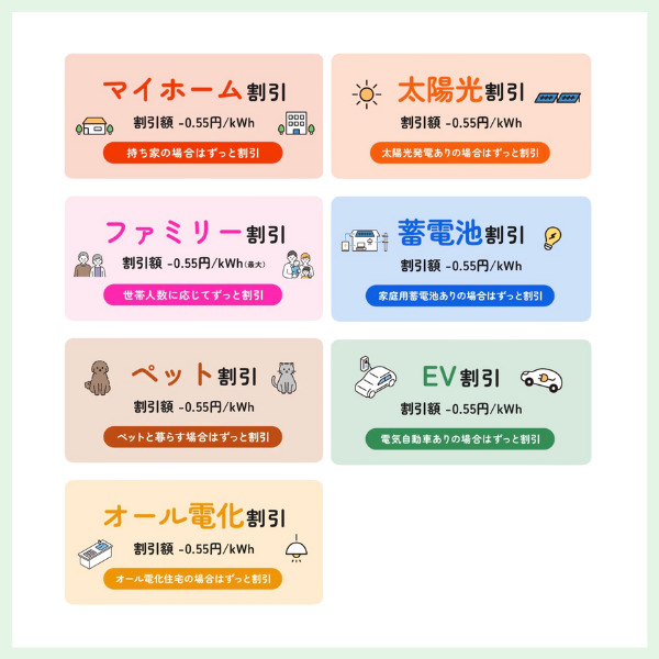| マイホーム割引 | <持ち家なら割引> 割引額:-0.55円/kWh |