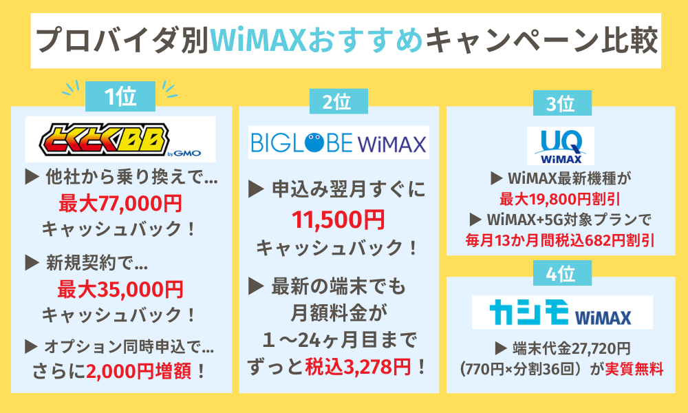 その中でも「GMOとくとくBB WiMAX」が一番おトクに利用できるキャンペーンを実施しています