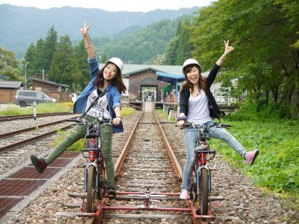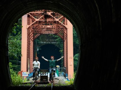 2023年にスタートした「レールマウンテンバイクGattan Go!!(ガッタンゴー)」。2006年11月末に廃線となった旧神岡鉄道の線路の上をマウンテンバイクで颯爽と駆け抜ける、新感覚の乗り物(出典:飛騨の旅)