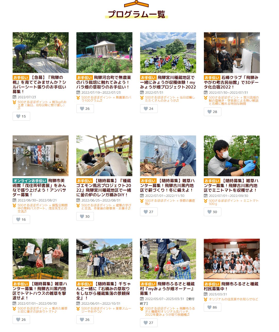 人口減少、少子高齢化が進む中で飛騨市が抱える「お困りごと」を、住民ではないが飛騨市を助けたい、飛騨市と関わりたい、飛騨市が好きという人がプログラムを通じて解決していきます。