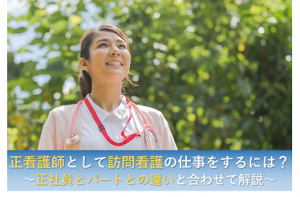 正看護師として訪問看護の仕事をするには?正社員とパートとの違いと合わせて解説 「正看護師として訪問看護の仕事がしたい」 「訪問看護で働くなら、正社員とパートだとどちらが良いのだろう?」 とお悩みではありませんか? 結論、正看護師が訪問看護...