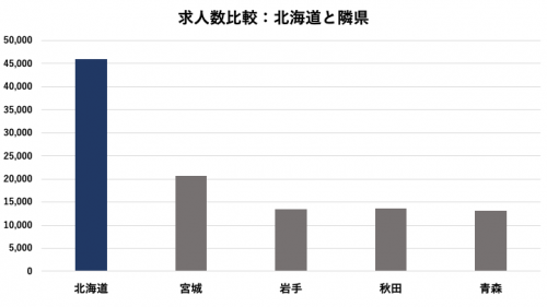 実際に、ハローワークで北海道と隣県での求人数を比較したところ、どの県よりも上回って求人数を保有しています。