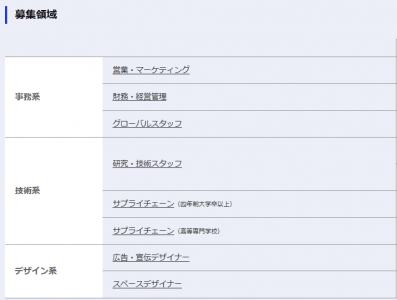 事務系・技術系ともに、一般的にメーカーで募集されている一通りの職種を採用しています。特徴的なのは、「グローバルスタッフ」という海外転勤も視野にいれたマーケティングやコーポレート部門のスタッフを別枠で募集している点です。グローバル戦略に重点をおいていることが良く分かります。