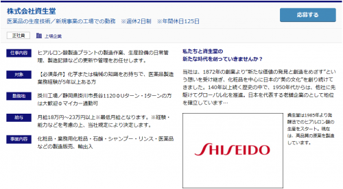 dodaで検索すると、技術系職は製造現場での製造作業、また生産設備の日常業務の募集のみでした。資生堂がトップシェアを誇り、高品質が評価されているヒアルロン酸の製造や、新製品の試製造等も行っている工場です。