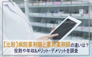 なお、病院薬剤師と薬局薬剤師の役割や年収の違い、それぞれ向いてる人について以下の記事で解説しています。「病院薬剤師と薬局薬剤師の違いを知ったうえで、転職先を考えたい!」という人はぜひ参考にしてみてください。