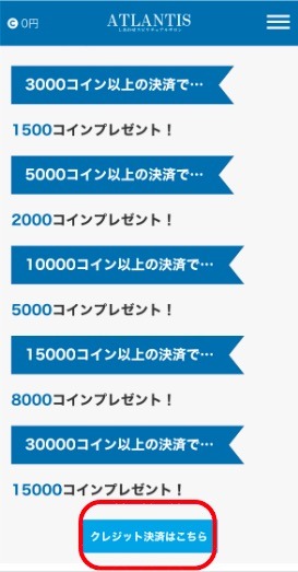 ![]() ![]() | ⑤今回は「クレジット決済はこちら」を押して、5000コイン(5,500円)を事前決済する |
