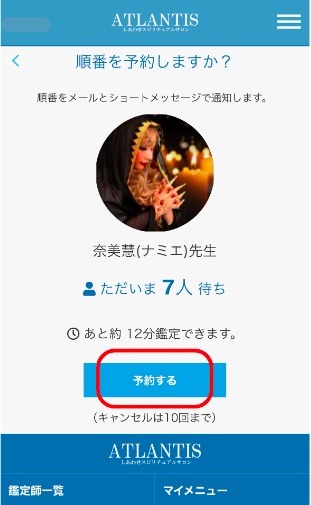 ![]() ![]() | ⑩「予約する」を押して順番を待つ |