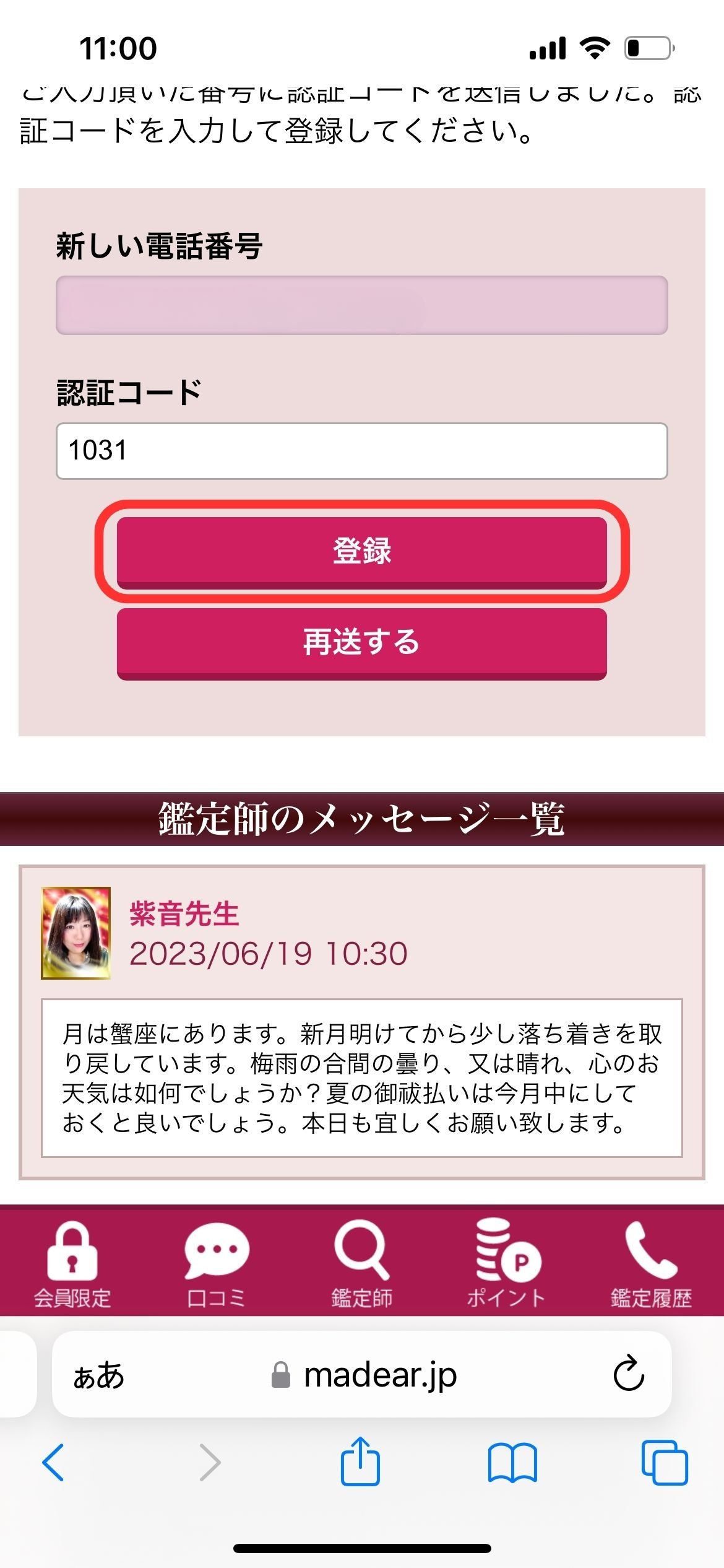 ![]() ![]() | ⑩入力した電話番号に認証コードが送られてくるので、認証コードを入力し「登録」を押す |