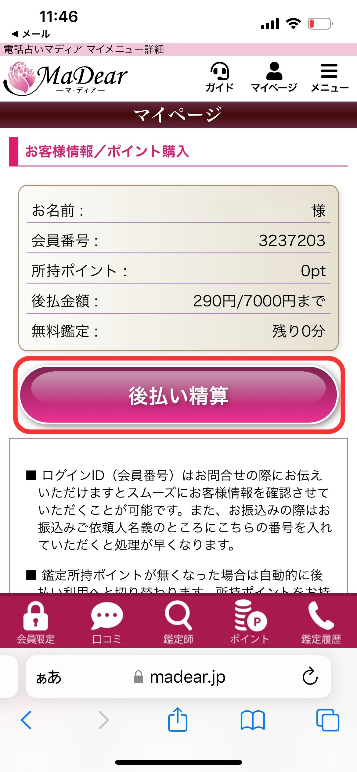 ![]() ![]() | ⑱マイページに移動し「後払い清算」を押す |