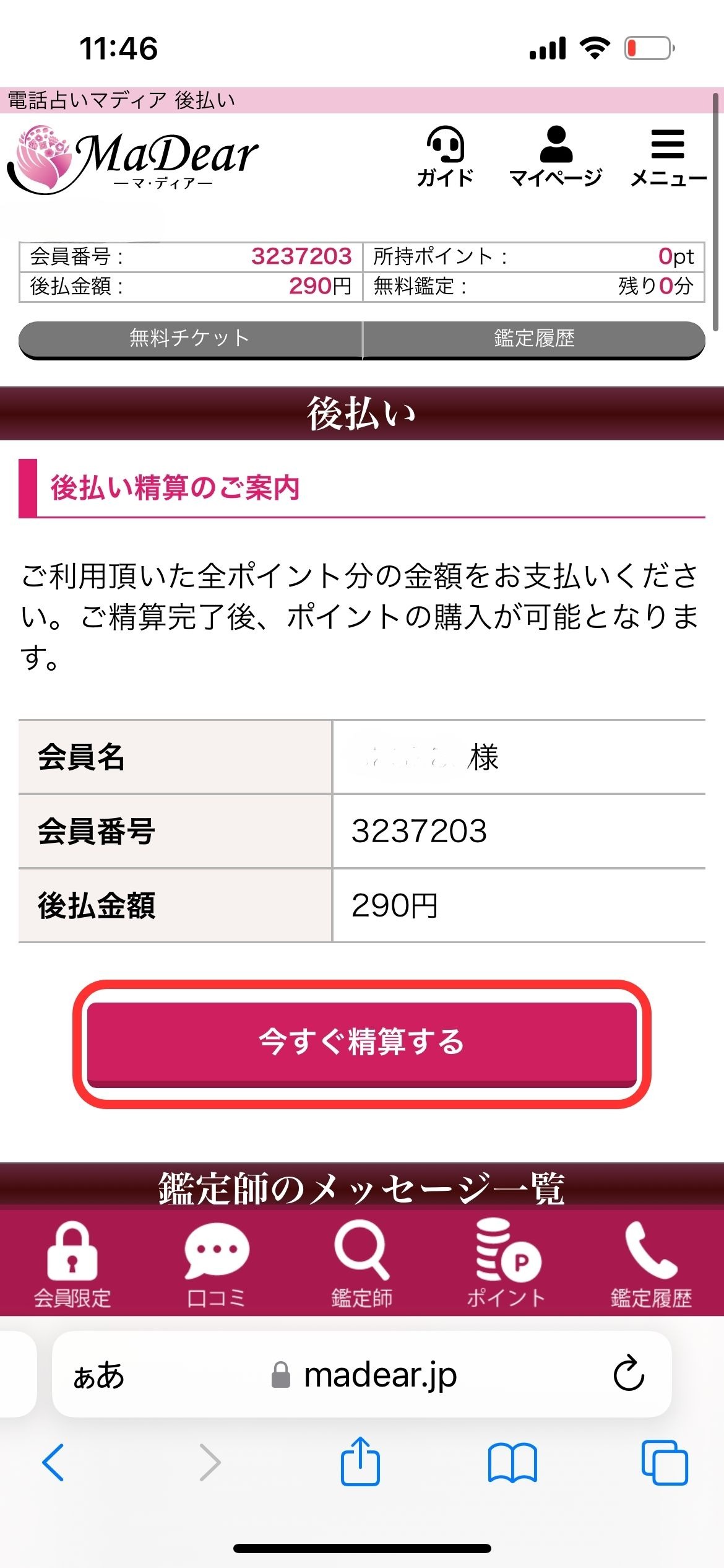 今回の鑑定は12分で料金は4,290円だったので、 3,000円無料クーポン+LINE登録の1,000円無料クーポンを使って、実質負担は290円でした。