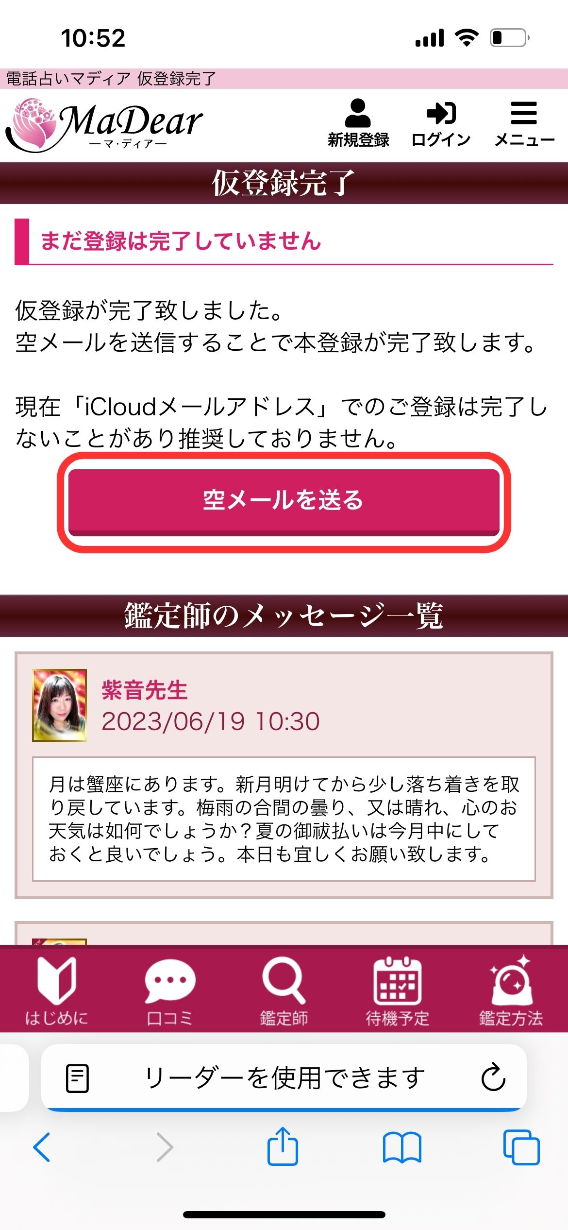 ![]() ![]() | ③仮登録用のメール送信の説明書きを読み「空メールを送る」を押す |