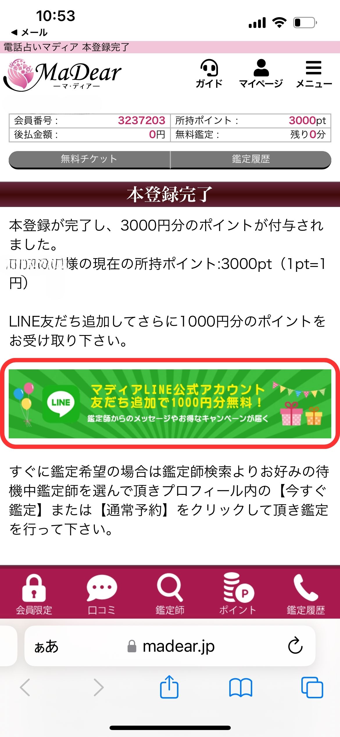 ![]() ![]() | ⑥メールに添付されたURLを押し、HPに飛ぶ【会員登録完了】 LINEアカウントの登録で1,000円無料クーポンがもらえるので、バナーを押す |