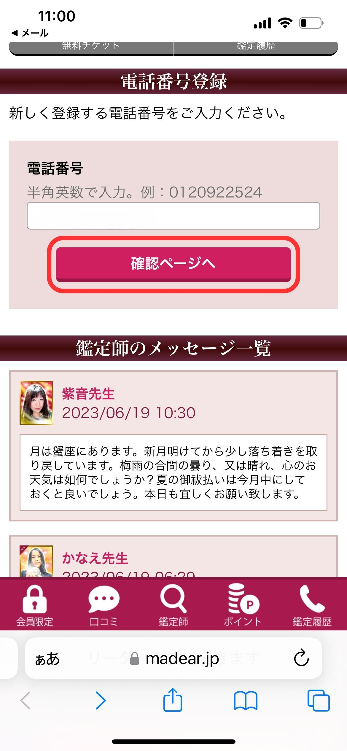 ![]() ![]() | ⑨電話番号を入力し「確認ページへ」を押す |