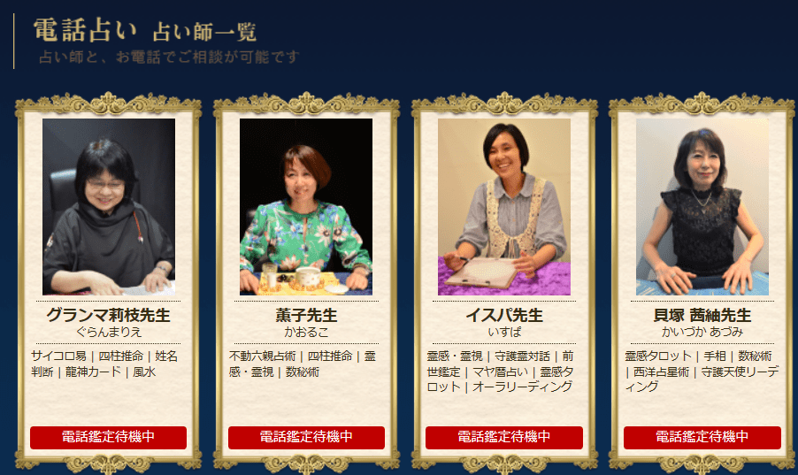| 占術 | 霊感・霊視、透視、自動書記、故人交信、霊感タロット、チャネリング、波動修正、遠隔ヒーリング・メンタル向上エネルギー・運気好転ヒーリング、手相、ペンジュラム、 西洋占星術、エネルギーワーク、アニマルリーディング | 霊感・霊視 | 霊感・霊視、四柱推命、ルノルマンカード、霊感タロット、数秘術、サイキック手相、ダウジング・ペンデュラム、ブロック解除、遠隔ヒーリング | 西洋占星術、数理術、ハートヒーリングタロット、カバラ数秘術 | 霊感タロット・祈祷祈願 | 霊感・霊視、霊聴、恋人交信、霊感タロット、手相、顔相、故人交信、西洋占星術、五行易、姓名判断、家相・墓相、オーラ診断、ルノルマンカード | チャネリング、ダウジング、オーラリーディング、スピリチュアル・リーディング、守護霊対話、前世鑑定、エネルギーワーク、ルノルマンカード、ジオマンシー、波動修正、レイキ、オーラ オラクルカード・龍神カード | 霊感・霊視、透視、霊聴、守護霊対話、前世・来世鑑定、チャネリング、 オーラ、自動書記、霊感タロッ、数秘術、ルノルマンカード、水晶占い、ペンジュラム、エネルギーワーク、西洋占星術、波動修正、レイキ、ヒーリング、祈願祈祷、送念、 除霊・浄霊 | 恋人交信、霊聴、霊感・霊視、故人交信、透視、縁結び、守護霊対話、前世鑑定、オーラ鑑定、霊感タロット、波動修正、遠隔ヒーリング | タロットカード、西洋占星術 |