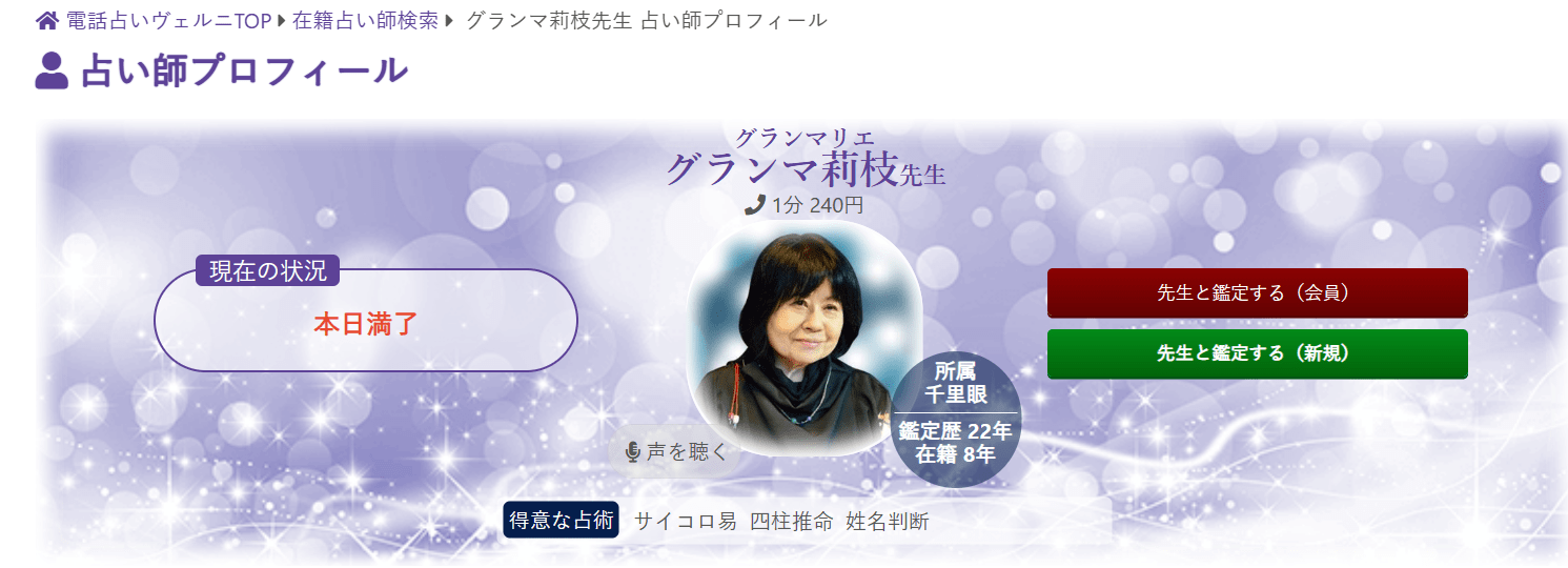 また占い師によって料金が異なる場合が多いですが、千里眼電話占いは全員1分240円なのが特徴です。
