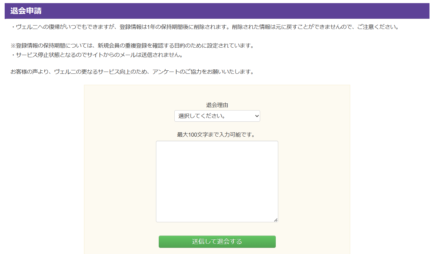 ![]() ![]() | ③退会理由を選択・理由を記入し「送信して退会する」をタップして完了 |