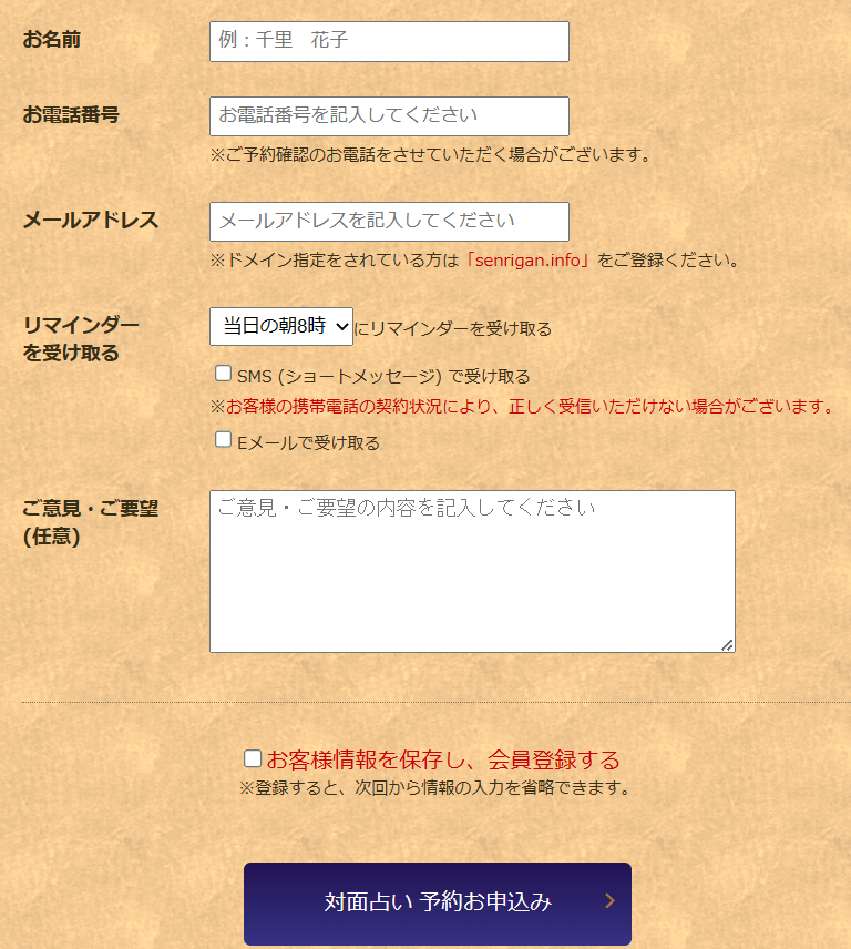 ![]() ![]() | ③「対面占い」をタップし以下の情報を入力する ・希望の日程と時間 ・名前 ・電話番号 ・メールアドレス ・リマインダーを受け取る時間 ・意見や要望 |
