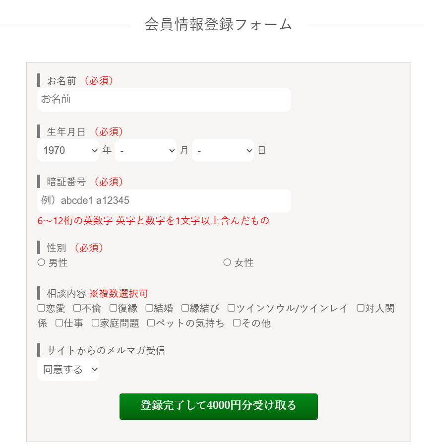 ![]() ![]() | ③以下の情報を入力したら「登録完了して4,000円分受け取る」をタップして完了 ・お名前 ・生年月日 ・電話番号 ・性別 ・相談内容 ・メルマガ受信の有無 |