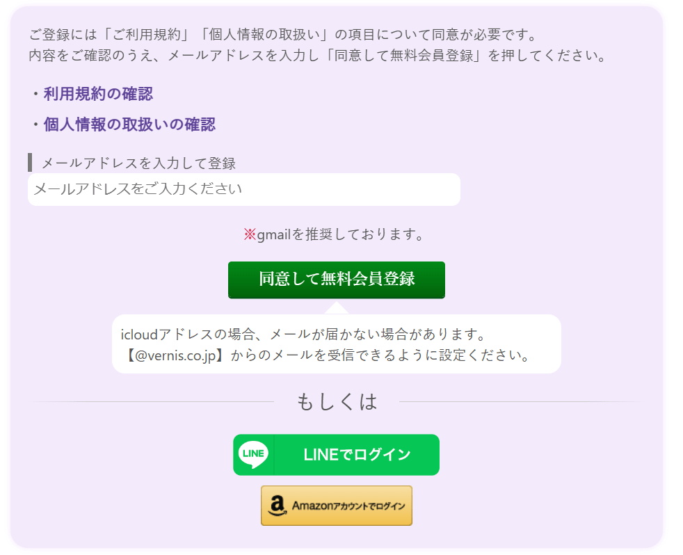 ![]() ![]() | ②メールアドレスを入力し「同意して無料会員登録」をタップ LINEやAmazonアカウントでもログイン可能 |