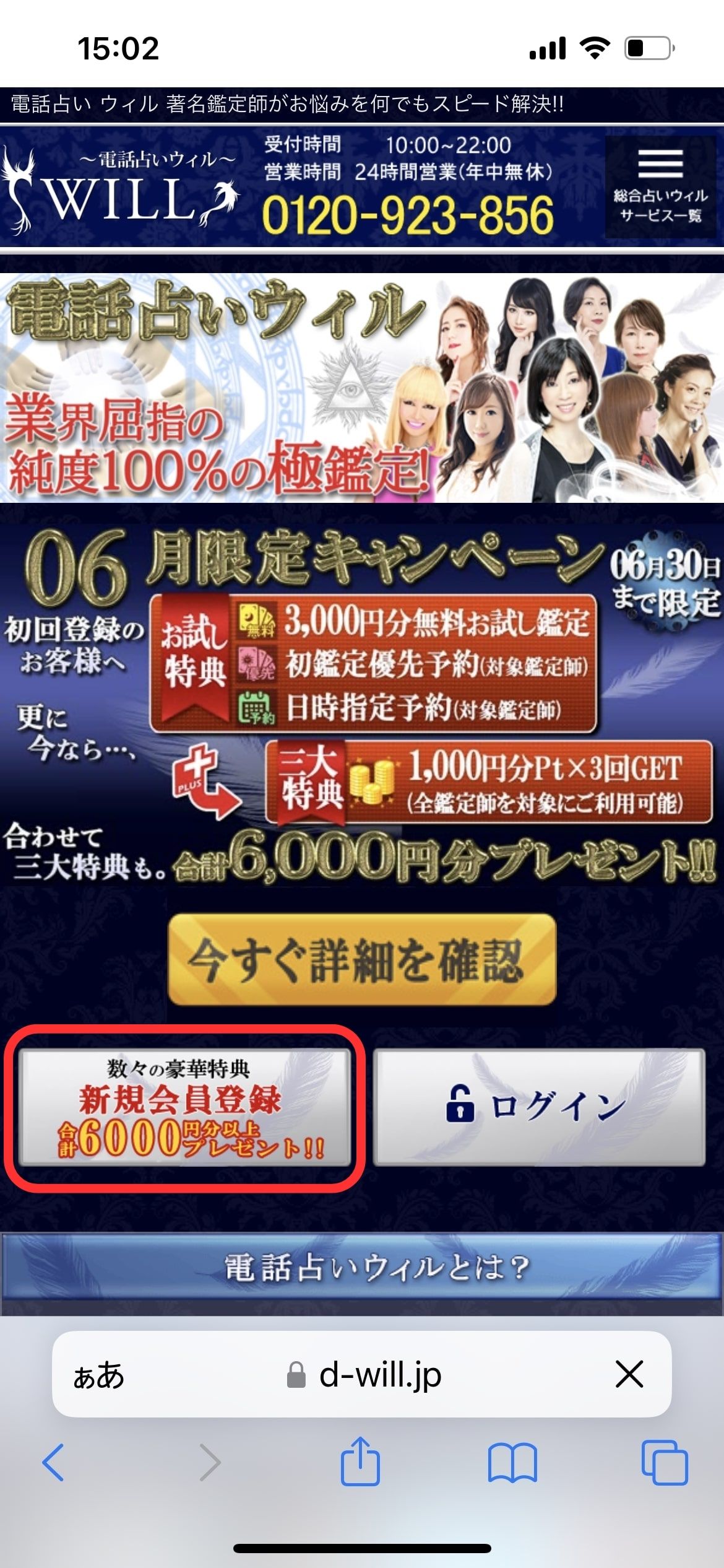 電話占いウィルには人気の占い師が多数在籍しており、新規登録した方には6,000円分の無料特典も受けられるのでお得です!