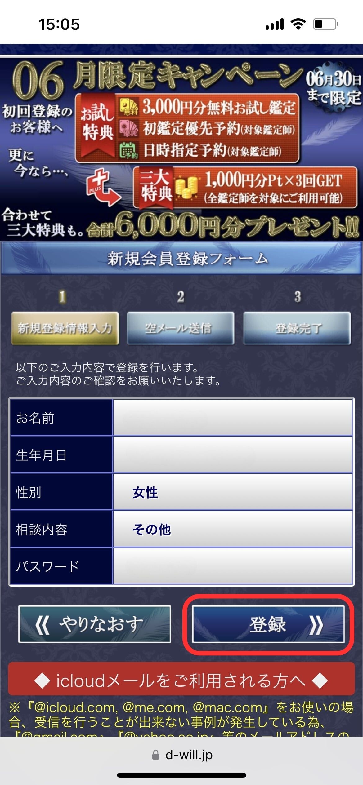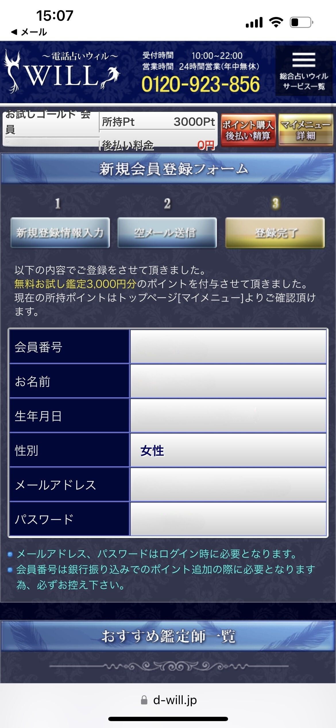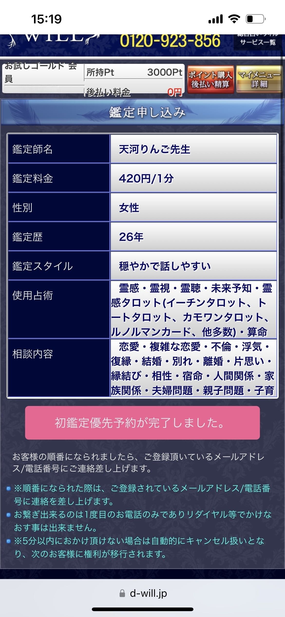 ![]() ![]() | ⑩「初鑑定優先予約が完了」になり、順番になると登録したメールアドレス/電話番号に連絡がくる【鑑定開始】 |