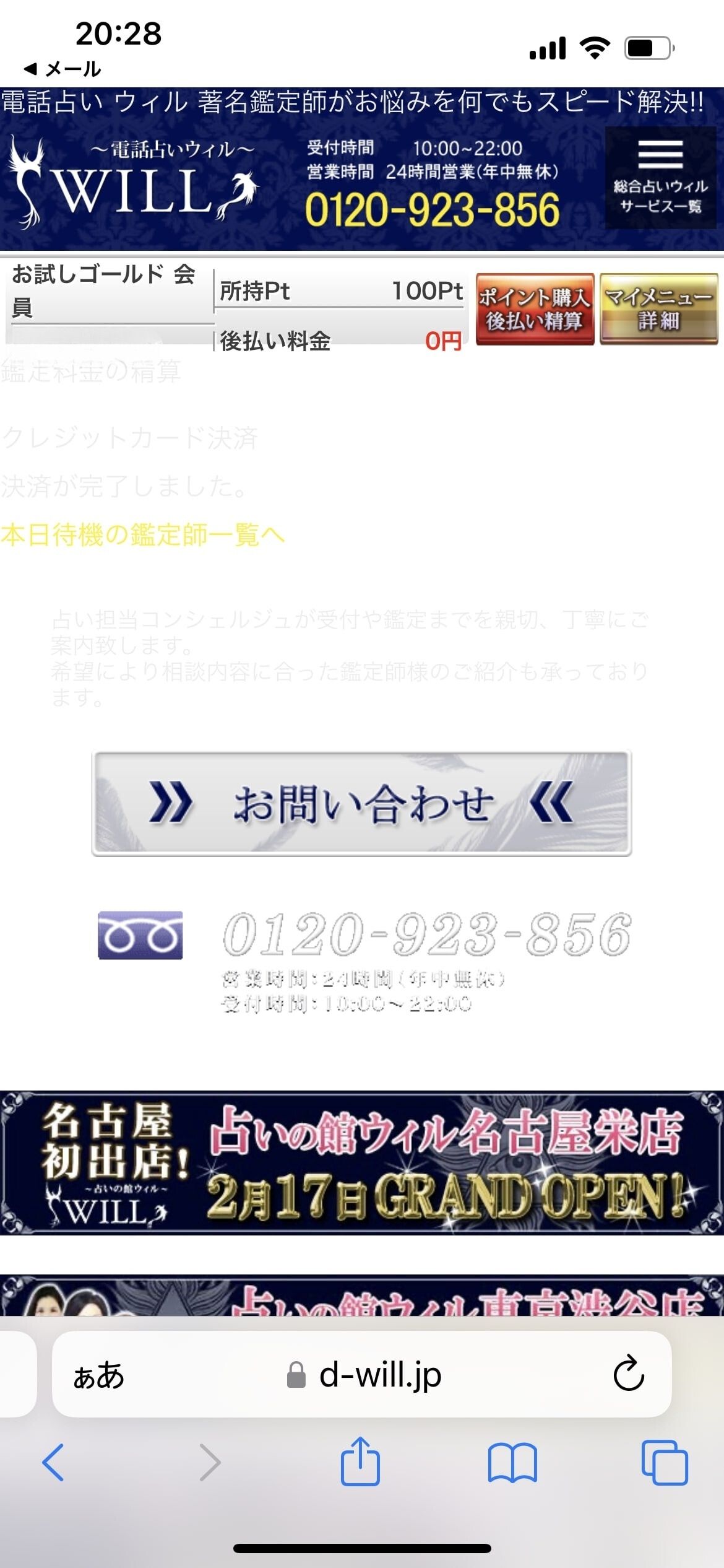 - 電話占いウィル公式サイトのページ下にある「お問い合せ」を押す