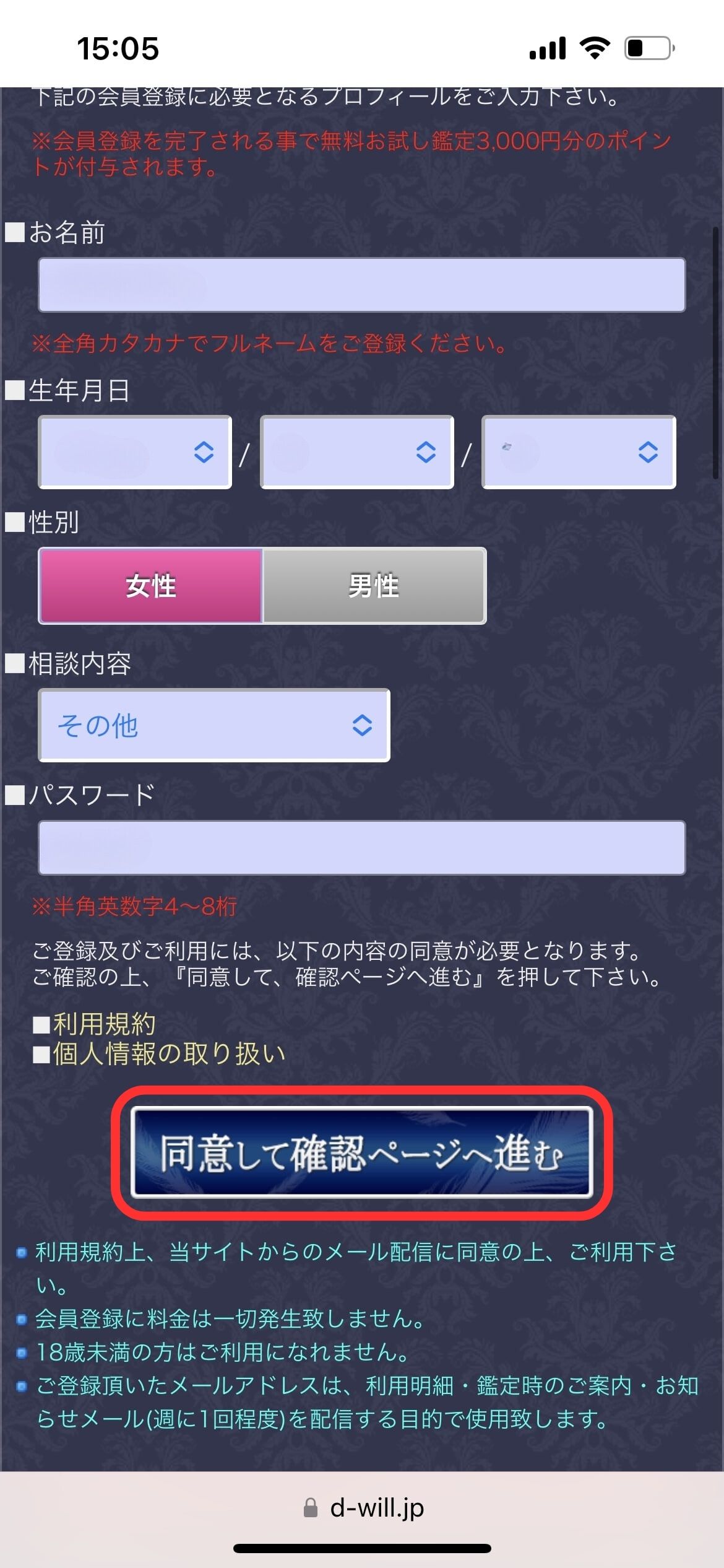 ![]() ![]() | ②必要情報を入力し、利用規約と個人情報の取り扱いを確認して「同意して確認ページへ進む」を押す ・名前 ・生年月日 ・性別 ・相談内容 ・パスワード |