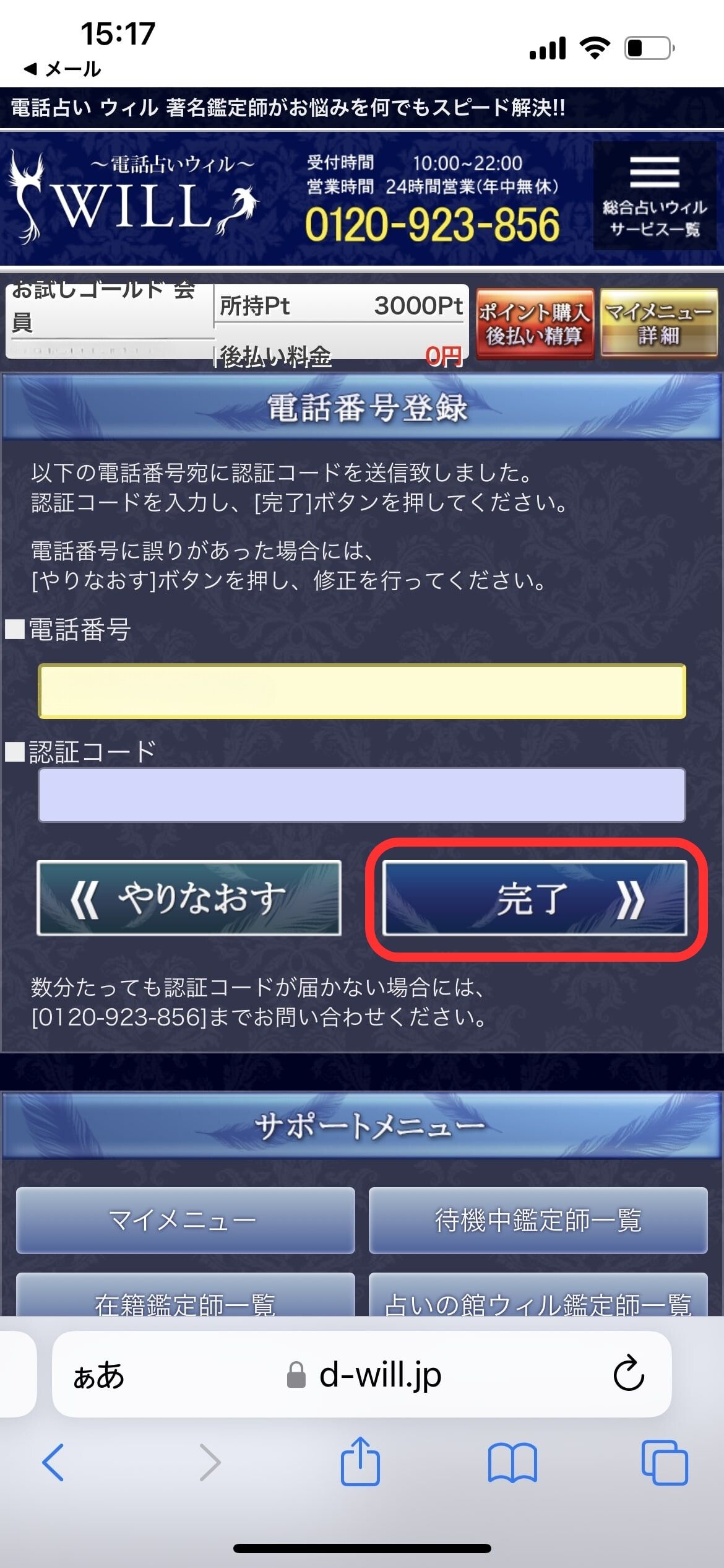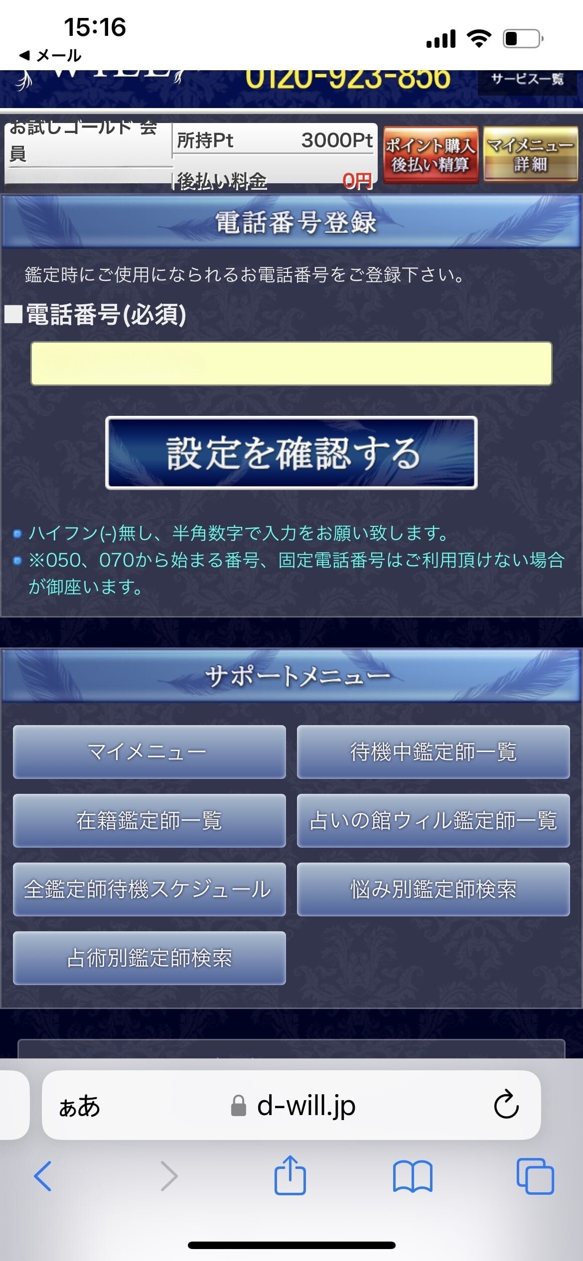 ![]() ![]() | ⑦待機中の占い師を選ぶと電話番号登録画面になるので、電話番号を入力し「設定を確認する」を押す |