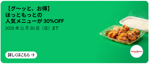 Uber Eats からほっともっとを注文すると、対象の人気メニューが30%オフに。「6コ入りから揚弁当」や「しょうが焼き弁当」などの定番メニューが対象です。