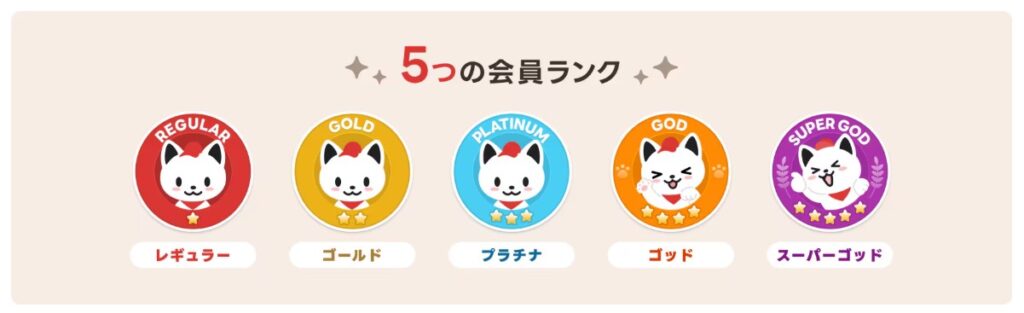 以下のように、注文金額によって5段階のランクが決まり、ランク・利用状況に応じた割引クーポン(20%OFF 送料割引など)がもらえます。