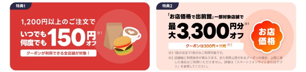 また、「お店価格で出前館」対象店舗なら1,200円以上の注文ごとに300円分・200円分のクーポン配布。最大6枚で1,700円分のお得も!