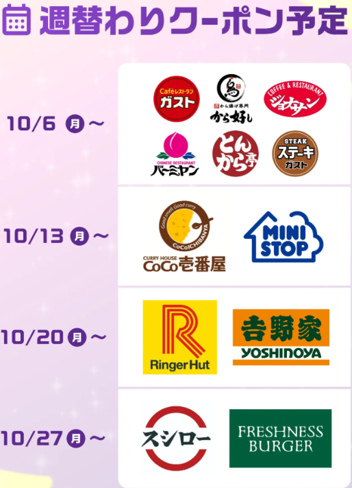 2025年10月は、「スシロー」「ガスト」「coco壱番屋」「吉野家」などの人気チェーンが対象です。