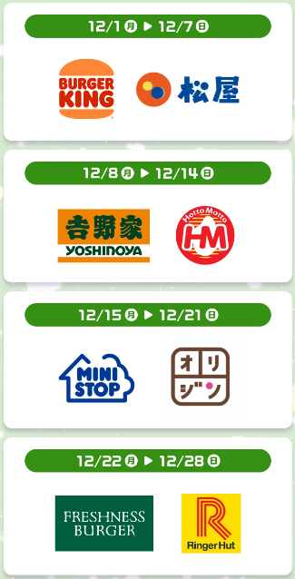 2025年12月は、「バーガーキング」「吉野家」「ミニストップ」「フレッシュネスバーガー」などの人気チェーンが対象です。