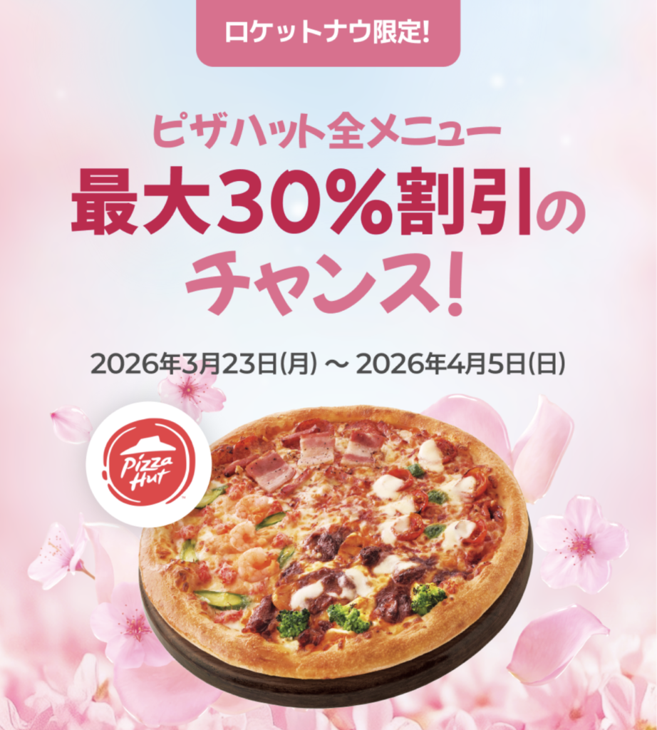 ロケットナウ対応のピザハットすべてのメニューが10%~30%オフ、送料はもちろん無料です。ピザハットを注文するなら今がお得!