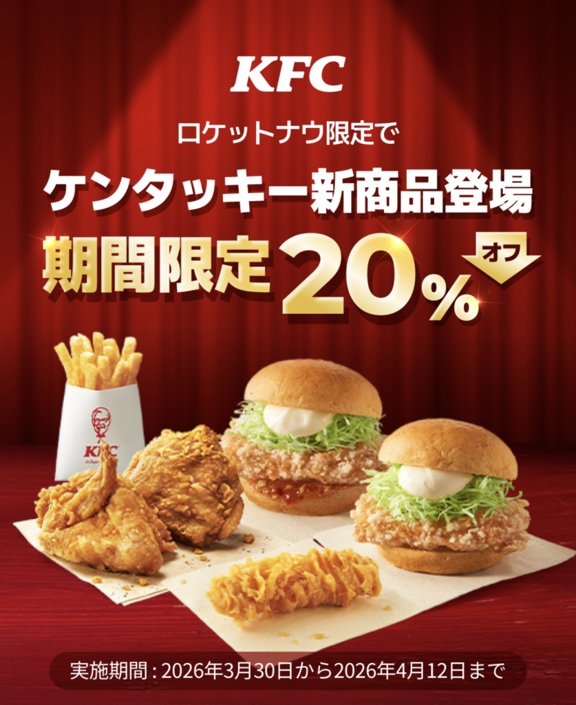 ケンタッキーからロケットナウ限定の新商品が登場!4月12日まで20%オフでお試しできます。