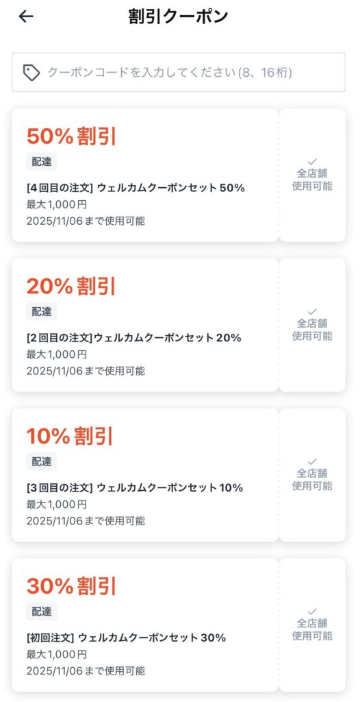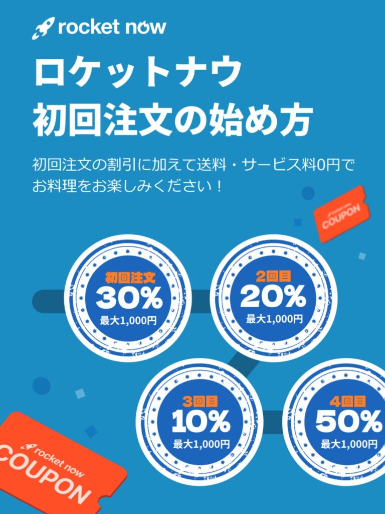 ロケットナウは、1回目、2回目、3回目、4回目の注文が合計で最大4,000円割引になる初回クーポンがあります。