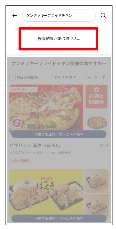 このため、エリアによっては該当する店がないこともあります。その場合は、以下のように「検索結果がありません」と表示されます。(例えば全国でケンタッキーに関するキャンペーンを開催する場合)