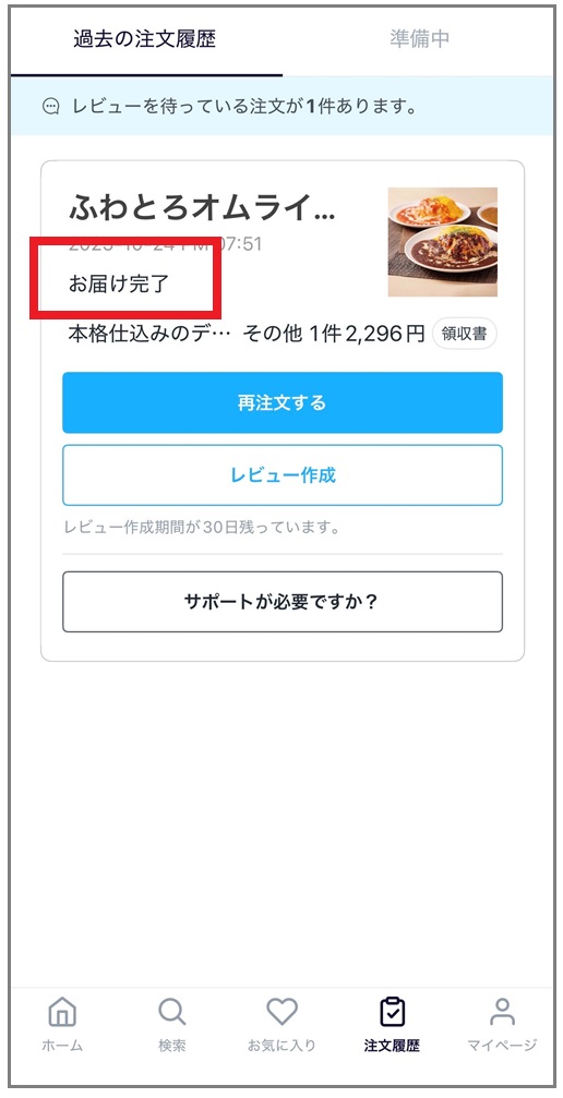 ここから領収書が出せたり、お店や配達員の評価がつけられたり、料理のレビューを書いたりできます(30日以内)。