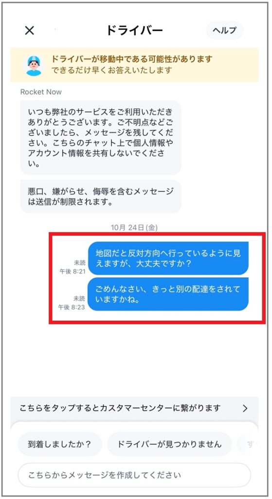 地図を見ると、あれ? 途中から配達員さんが逆方向へ直進している!? こんなとき、配達員さんにチャットで連絡できます。やってみました。
