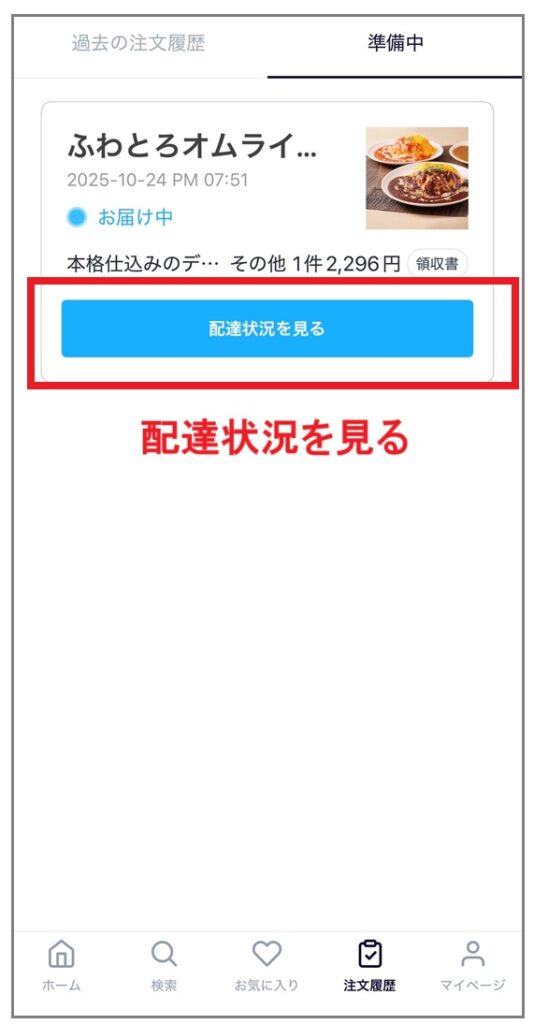 アプリを見ると、お届け完了画面が表示されていました。
