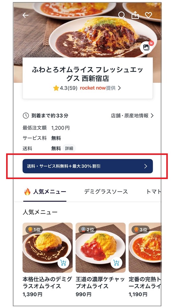 そんななか、今日はオムライスの専門店に決定!「送料・サービス料+最大30%割引」と表示されていて安心します。