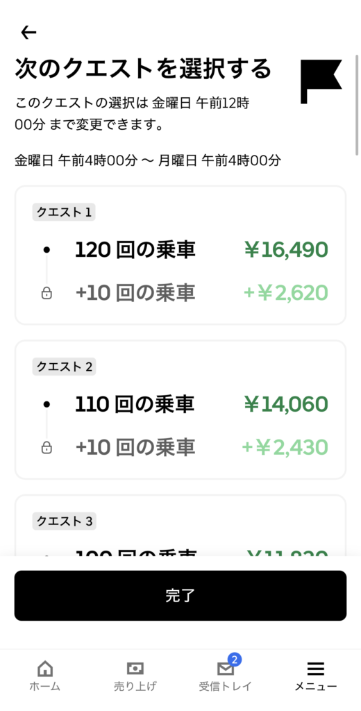 「クエスト」もUber Eats 独自の追加報酬で、決められた配達件数をこなすことでもらえるボーナスのようなものです。